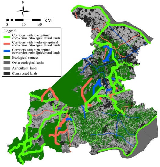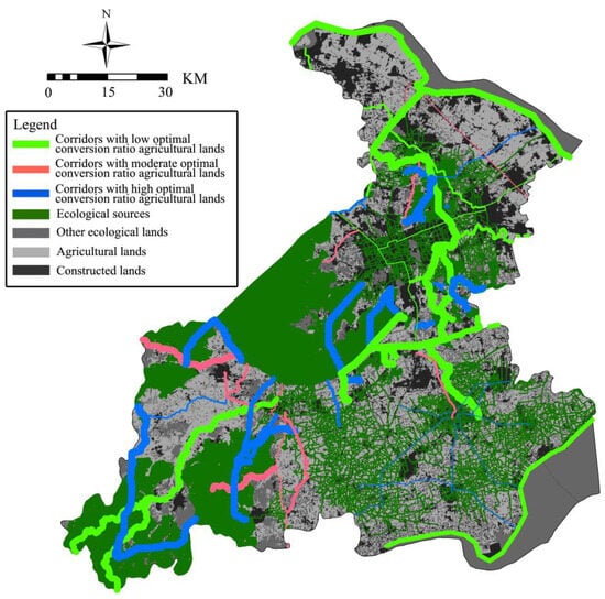 Spatial distributions of ecological corridors, including different optimal conversion ratios of agricultural lands in the study area (source: drawn by the authors).
