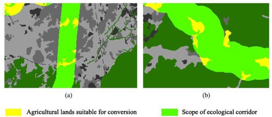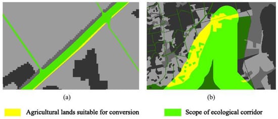 Schematic diagram of optimization proposals for agricultural land with a high optimal conversion ratio: (a) Agricultural land with small area within the planning scope of narrower corridors; (b) Agricultural land located at the edge of the ecological corridor enhances the edge effect (source: drawn by the authors using ArcGIS 10.6 software).