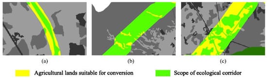 Schematic diagram of optimization proposals for agricultural land with moderate optimal conversion ratio: (a) Agricultural land located at the edge of the ecological corridor enhances the edge effect; (b) Scattered small-scale agricultural lands within the ecological corridor; (c) Agricultural land between ecological stepping stones (source: drawn by the authors using ArcGIS 10.6 software).
