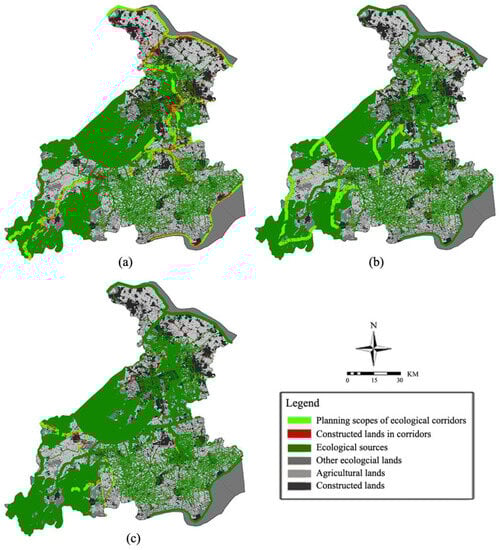 Spatial distributions of constructed lands in the ecological corridors with different optimal conversion ratios Spatial distributions of constructed lands with: (a) low optimal conversion ratio, (b) moderate optimal conversion ratio, and (c) high optimal conversion ratio in the ecological corridors. (source: drawn by the authors).