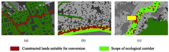 Schematic diagram of optimization proposals for constructed lands with low optimal conversion ratios: (a) Constructed land located in the ecological corridor passing through the large-scale urban space; (b) Constructed land located in the ecological corridor passing through the contiguous rural settlements; (c) Constructed land dispersed in ecological corridors but most likely to block biological flow and landscape flow (source: drawn by the authors using ArcGIS 10.6 software).