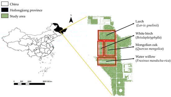 The study area is located in the urban forestry demonstration base of Harbin, Heilongjiang province (126°37′458″ E, 45°43′464″ N), with a flat topography, a zonal black calcium soil type, high humus content, deep soil layer, high accumulation of dead fuels on the forest floor, and good soil fertility and moisture conditions. The area has a mid-temperate continental monsoon climate, with an average annual temperature of 3.5 °C, a maximum temperature of 38 °C, and a minimum temperature of −37 °C, and an average annual precipitation of 534 mm. At present, the site has more than 40 hm2 of various types of planted forests, with vegetation types mainly consisting of white birch (Betulaplatyphylla), Mongolian oak (Quercus mongolica), walnut (Juglans mandshurica), water willow (Fraxinus mandschu-rica), black-barked oil pine (Pinus tabuliformis var. mukdensis), camphor pine (Pinus sylvestris var. mongolica), larch (Lar-ix gmelinii), etc. The above vegetation is widely distributed and numerous in China, among which the accumulation of larch accounts for 7.30% of the total forest accumulation in China, ranking fifth; the accumulation of water willow and walnut accounts for 1.12% of the total forest accumulation in China, ranking thirteenth; and the accumulation of camphor pine accounts for 0.53% of the total forest accumulation in China, ranking twenty-first. The urban forestry demonstration base in Harbin City has rich and typical vegetation types and a high accumulation of dead combustibles in the understory surface. Therefore, choosing it as the study area can ensure the representativeness of the experimental data, and the results of the study have a certain reference value, providing a reference for the study in other similar areas (Figure 1).