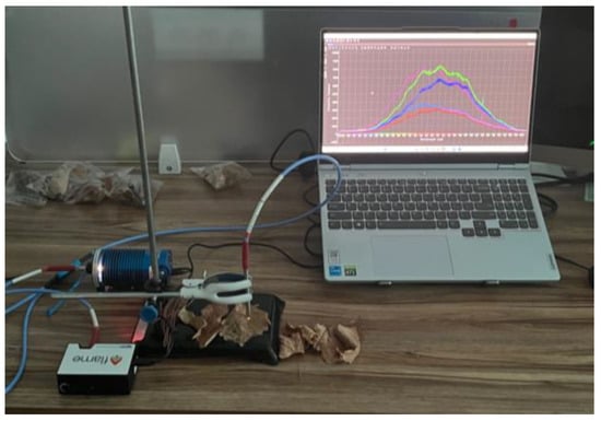 Dead fuel samples were taken from four species of trees (Mongolian oak, water willow, white birch, and larch) of the same phenology in the Harbin Urban Forestry Demonstration Base, and the sample collection method was referenced from Catchpole’s study. In order to simulate the wet state of dead combustibles in the natural environment, all samples were soaked in distilled water for 1 h, and control groups with different moisture contents of the same dead combustibles were set up by controlling the difference in the drying time of the samples. Then, the samples were measured by the Flame spectrometer of Ocean Optics, with a spectral resolution of 1 nm, combined with a “Y” type optical fiber for visible reflectance spectroscopy, and the light source used was an HL-2000 tungsten halogen lamp with a power of 5 W (Figure 2).