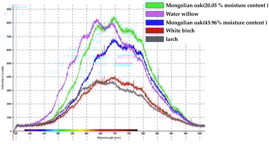 The spectrometer was connected to a computer, and the reflection spectra measured in real time were displayed through OceanView 2.0.8 software, and the measurement results are shown in Figure 3. From the figure, it can be seen that the intensity of the reflection spectra of the dead fuel from different tree species differed after soaking for the same time, with the highest intensity of the reflection spectra of the dead fuel material from the Mongolian oak and the lowest intensity of the reflection spectra of the dead fuel material from the larch. The peak reflectance spectra of different species are also different, such as the peak wavelength of the reflectance spectra of the dead fuel from the water willow being 641 nm, and the peak wavelength of the reflectance spectra of the dead fuel from the Mongolian oak being 696 nm. The green and blue spectra are the reflectance spectra of the same species of dead fuel, soaked for the same time and dried for different times, that is, with different moisture content. Therefore, the intensity of the reflectance spectra of the same kind of withered material with different water content is also different. The above results provide a basis for the selection of spectral bands in the actual measurement and provide the feasibility for the subsequent prediction of DFMC by multispectral imagery.