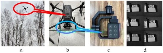Diagram of the data acquisition equipment. In figure (a), the UAV is flying a mission over the study area; figure (b) is the M300RTK UAV used in this paper; figure (c) is the MS600PRO multispectral camera on board the UAV platform; figure (d) is a six-band image of the calibration gray plate taken with a multispectral camera.