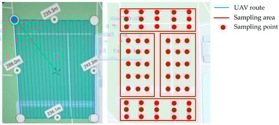 Diagram of the UAV’s flight path and dead combustible sample sampling points. The green line in the left figure is the flight route of the UAV, the part surrounded by the red dotted line in the right figure is the dead combustible sample sampling area, and the 15 red dots are the dead combustible sample sampling points.
