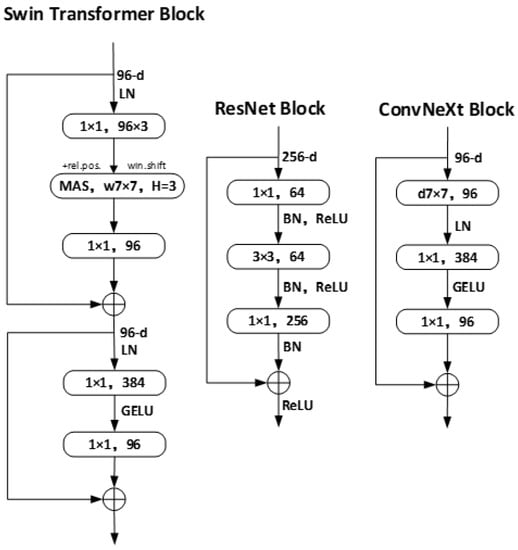 Block design of ResNet, Swin Transformer, and ConvNeXt.