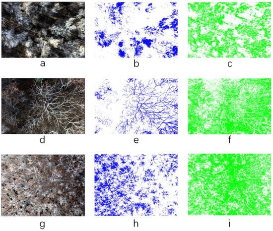 K-means segmented images. (a,d,g) are surface pseudocolor images; (b,e,h) are multispectral images of tree masks segmented by K-means; (c,f,i) are multispectral images of surface dead fuel masks segmented by K-means.