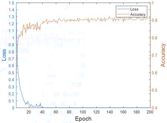 In this paper, the ConvNeXt model, which is currently the best performing model in the classification problem [], was chosen as the model for this experiment. In total, 3985 images were used for the training set, 504 images for the validation set, and 498 images for the test set, all of which were 6-channel multispectral images. The input to the ConvNeXt model in this experiment is a 256 × 256 × 6 image, which is downsampled once by a convolutional layer of size 4 × 4 and layout 4, turning the height and width of the image into 1/4 of its original size, and then passed through four stages in turn; each stage is composed of a series of ConvNeXt blocks, and the ratio of the four stages is 3:3:9:9. The output of the last stage is subjected to global average pooling, layer normalization, and finally, the confidence scores of the eight categories are output after a fully connected layer, and the output is transformed into a probability distribution using the Softmax function. The experimental model was trained using an AdamW optimizer with an initial learning rate of 0.0001. In total, 200 epochs were trained and the model with the highest accuracy was saved as the best model, with the final model having an accuracy of 92.26% (Figure 10).