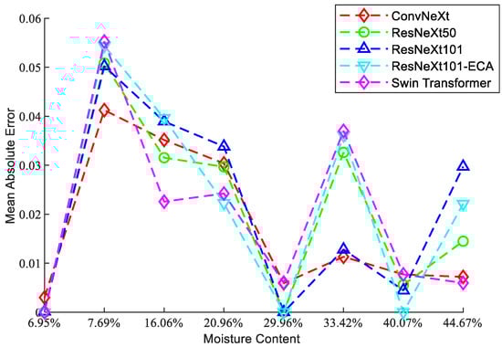 To evaluate the performance of neural networks for predicting DFMC, four convolutional neural network models were used, ConvNeXt, ResNeXt50, ResNeXt101, ResNeXt101-ECA (ResNeXt101 model with integrated ECA channel attention module), and one Transformer model (Swin Transformer); the five models are outstanding in the current image vision field. Training was performed on the dataset produced in this paper, all using the AdamW optimizer with an initial learning rate of 0.0001. In total, 200 epochs were trained, and the model with the highest accuracy was saved as the best model (Figure 13).
