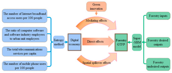 In addition to the direct impact of the digital economy itself on forestry GTFP, it may also indirectly affect forestry GTFP by promoting green technology innovation. By enabling digitalized applications and management, the digital economy breaks down barriers to information flow. This can improve traditional market environments, allowing producers to quickly and accurately capture differentiated demand information for green products in the market [36]. This enhances producers’ competitiveness regarding green innovative products. Moreover, the digital economy aims to reduce costs in human resources, capital, etc. This enables more funds to be invested in the R&D and promotion of green innovation technologies, improving production efficiency and green innovation levels [37]. The improvement in green innovation levels can facilitate the development and application of green and ecofriendly technologies, lower barriers to green technologies, and promote technology diffusion, thereby increasing forestry green total factor productivity. Hence, the digital economy affects forestry green total factor productivity through green innovation by introducing green innovative technologies, transforming urban forestry industries from traditional extensive production management models to green, low-carbon and clean energy approaches [38]. It also enables dynamic adjustment of production factors in industries to improve forestry green total factor productivity. Meanwhile, the application of green innovation technologies enables information sharing and collaboration between innovation entities, providing an intrinsic impetus for the growth of forestry GTFP [3], and providing theoretical support for reducing undesirable outputs in forestry.