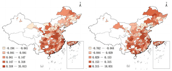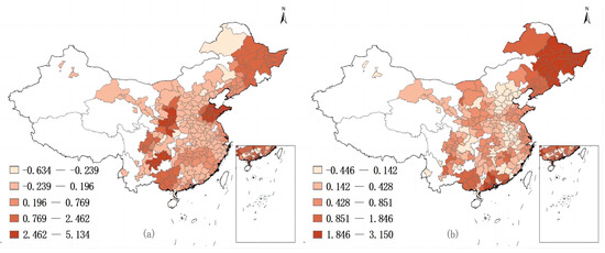 Spatial and temporal evolution of green total factor productivity in forestry in 277 cities in China in 2013 (a) and 2019 (b).