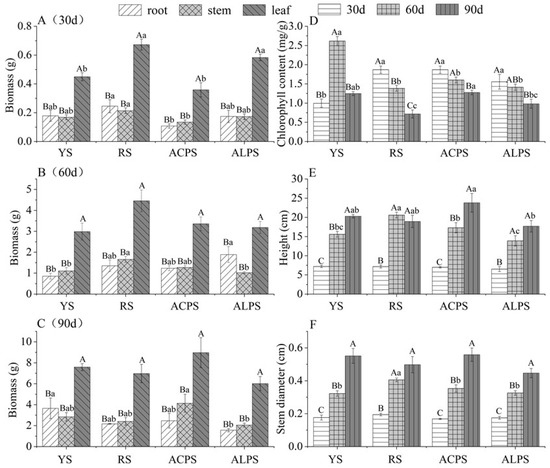 Effects of soil types on growth parameters and leaf chlorophyll contents in P. chinense seedlings at three growth stages. (A), Biomass of leaves, stems and roots of seedlings in four soil types at 30 day. (B), Biomass of leaves, stems and roots of seedlings in four soil types at 60 day. (C), Biomass of leaves, stems and roots of seedlings in four soil types at 90 day. (D), Chlorophyll content in leaves at three growth stages in four soil types. (E), Plant height of seedlings at three growth stages in four soil types. (F), Stem diameter of seedlings at three growth stages in four soil types. YS, yellow soil. RS, red soil. ACPS, acidic purple soil. ALPS, alkaline purple soil. Data represent mean ± S.E., n = 3. Lowercase letters represent significant differences in different soil types, and capital letters represent significant differences in different organs, with a significance level of 0.05.