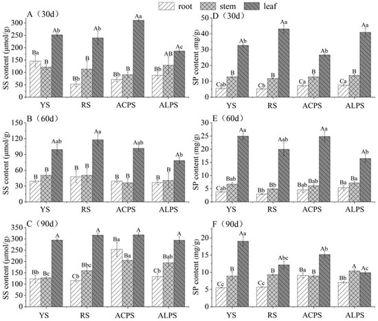 As shown in Figure 2A–C, SS content in leaves, stems, and roots shows larger differences among soil types at three growth stages. At 30 days, the SS content ranges from 186.6 to 252.0 μmol/g in the leaves, from 90.5 to 129.0 μmol/g in the stems, and from 52.9 to 145.7 μmol/g in the roots. The maximum values in the leaves, stems, and roots are observed in ACPS, ALPS, and YS, respectively. At day 60 and 90, the SS content in the different organs is significantly less than those at 30 days and shows remarkable variations in the four soil types. These results show that the SS content in different organs of P. chinense seedlings is associated with soil types and growth stages. As shown in Figure 2D–F, the SP content in different organs of P. chinense seedlings exhibits significant differences at three growth stages and in four soil types. At day 30, the SP content ranges from 26.6 to 43.1 mg/g in the leaves, from 11.8 to 13.7 mg/g in the stems, and from 5.24 to 7.56 mg/g in the roots. The maximum values in the leaves, stems, and roots are observed in RS, ALPS, and ALPS, respectively. At day 60, the SP content in different organs is significantly lower than those of day 30. Similarly, at day 90, the SP content in the leaves is significantly lower than those of at day 60. However, the SP content in the stems and roots show an opposite trend. These results show that the SP content of different organs of P. chinense seedlings has different responses to growth stages and four soil types.