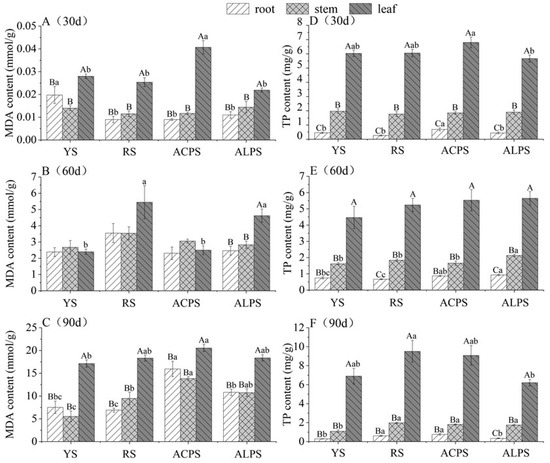As shown in Figure 3A–C, the results show that there are higher variations in MDA content in different organs of P. chinense seedlings than those at different stages and among four soil types. At day 30, the MDA content in the leaves varies from 2.19 × 10−2 to 4.07 × 10−2 mmol/g, ranges from 1.15 × 10−2 to 1.44 × 10−2 mmol/g in the stems, while the content in the roots ranges from 0.90 × 10−2 to 1.98 × 10−2 mmol/g. The MDA levels of leaves, stems, and roots reach their maximum values in ACPS, ALPS, and YS, respectively. When cultured for 60 days, the MDA content in the leaves, stems, and roots reach their maximum values in RS, these values being 5.45 mmol/g, 3.54 mmol/g, and 3.55 mmol/g, respectively. With the rising culture time up to 90 days, the MDA content of different organs significantly increases in four soil types, and these values are significantly higher than those of 30 and 60 days. As shown in Figure 3D–F, there are significant differences in the TP content in various organs cultured in four soil types at three growth stages. At 30 days of cultivation, the TP content in the leaves, stems, and roots reaches its maximum value when seedlings are cultured in ACPS, YS, and ACPS, representing 6.80 mg/g, 1.96 mg/g, and 0.69 mg/g, respectively. When cultured for 60 days, the TP content in the leaves, stems, and roots reaches its maximum in ALPS, these values being 5.65 mg/g, 2.13 mg/g, and 0.933 mg/g, respectively. At 90 days of cultivation, the TP content in the leaves and stems reaches its maximum value in RS, the values being 9.51 mg/g and 1.97 mg/g, respectively. However, the highest levels in the roots are found when seedlings are cultured in ACPS, and the peak levels are 0.765 mg/g. These results show that the variations in MDA and TP content in the different organs of P. chinense seedlings depend on soil types and growth stages. Moreover, it could be observed that the MDA and TP content in the leaves is significantly higher than those of in the stems and roots.