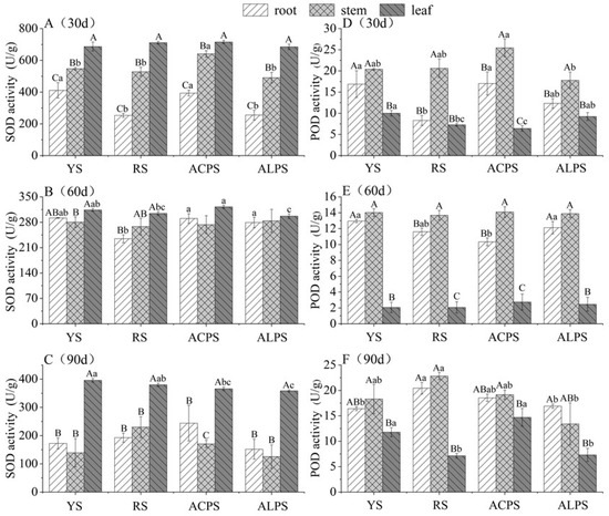 Effects of soil types on superoxide dismutase (SOD) and peroxidase (POD) activities in P. chinense seedlings at three growth stages. (A), SOD activities in leaves, stems and roots of seedlings at 30 days in four soil types. (B), SOD activities in leaves, stems and roots of seedlings at 60 days in four soil types. (C), SOD activities in leaves, stems and roots of seedlings at 90 days in four soil types. (D), POD activities in leaves, stems and roots of seedlings at 30 days in four soil types. (E), POD activities in leaves, stems and roots of seedlings at 60 days in four soil types. (F), POD activities in leaves, stems and roots of seedlings at 90 days in four soil types. YS, yellow soil. RS, red soil. ACPS, acidic purple soil. ALPS, alkaline purple soil. Data represent mean ± S.E., n = 3. Lowercase letters represent significant differences in different soil types, and capital letters represent significant differences in different organs, with a significance level of 0.05.