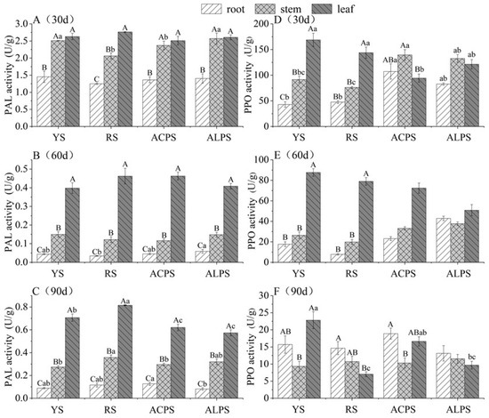 Effect of soil types on phenylalanine ammonialyase (PAL) and polyphenol oxidase (PPO) activities in P. chinense seedlings at three growth stages. (A), PAL activities in leaves, stems and roots of seedlings at 30 days in four soil types. (B), PAL activities in leaves, stems and roots of seedlings at 60 days in four soil types. (C), PAL activities in leaves, stems and roots of seedlings at 90 days in four soil types. (D), PPO activities in leaves, stems and roots of seedlings at 30 days in four soil types. (E), PPO activities in leaves, stems and roots of seedlings at 60 days in four soil types. (F), PPO activities in leaves, stems and roots of seedlings at 90 days in four soil types. YS, yellow soil. RS, red soil. ACPS, acidic purple soil. ALPS, alkaline purple soil.Data represent mean ± S.E., n = 3. Lowercase letters represent significant differences in different soil types, and capital letters represent significant differences in different organs, with a significance level of 0.05.