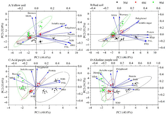 Principal component analysis (PCA) of biomass, physiological indexes of P. chinense seedlings in response to four soil types at three growth stages. (A) Yellow soil, (B) red soil, (C) acidic purple soil, and (D) alkaline purple soil. Loading of variables (MDA, malondialdehyde; SOD, superoxide dismutase; POD, peroxidase; PPO, polyphenol oxidase; PAL, phenylalanine ammonialyase; L, leaves; S, stems; R, roots) in PC1 and PC2 are shown by the direction and strength of the vector lines. Percent variation explained by each component is given next to the axis. Length of the variable vector shows a discriminative property of trait studied. Location of a trait in diagram closest to the intersection of 0 on the X-axis (PC1) and Y-axis (PC2) shows similarity.