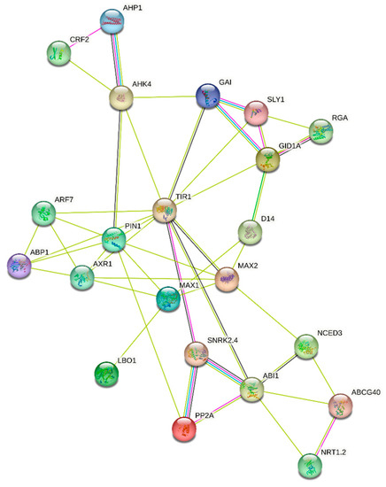 Interactions between proteins were analyzed with STRING. The represented proteins belong to abscisic acid (NCED3, ABCG40, NRT1.2, SNRK2.4, ABI1), auxins (PIN1, PP2A, ABP1, TIR1, ARF7, AXR1), cytokinins (AHK4, AHP1, CRF2), strigolactones (LBO1, MAX1, D14, MAX2), and gibberellins (GID1A, GAI, RGA, SLY1). The edges represent the predicted functional associations. A red line indicates the presence of fusion evidence; a green line—neighborhood evidence; a blue line—co-occurrence evidence; a purple line—experimental evidence; a yellow line—textmining evidence; a light blue line—database evidence; and a black line—co-expression evidence.