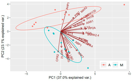 Expression data were analyzed by PCA, which explained 60.1% of the variation observed. The Atlantic and Mediterranean types were separated by principal component two. The differences observed between groups were mainly explained by AHP1, PIN1, MAX2, CRF2, NRT12, MAX1, ABCG40, GID1, and LBO data (Figure 3).