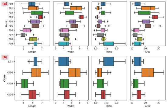 Boxplots for leaf morphological characteristics: (a) Boxplots of the four morphological traits for ten plants, namely P00, P01, P02, P03, P04, P05, P06, P07, P08, and P09. (b) Boxplots of the four morphological traits for four clones or genotypes, including NX06, NX09, NX10, and JL11. NX06, NX09 and NX10 were collected from in Ningxia Province, China, and JL11 was collected from Jilin Province, China. The four morphological traits are the length (cm), width (cm), the ratio of length to width, and area size (cm2) of P. simonii leaves. The lower side, the inner line, and the upper side of the box in the boxplot graph are Q1 (the first quartile), median (the second quartile), and Q3 (the third quartile), respectively. The lower and upper whisker of the boxplot graph are Q1 − 1.5 × IQR (interquartile range) and Q3 + 1.5 × IQR, respectively. The values flanking the lower and upper whisker are plotted as diamond.