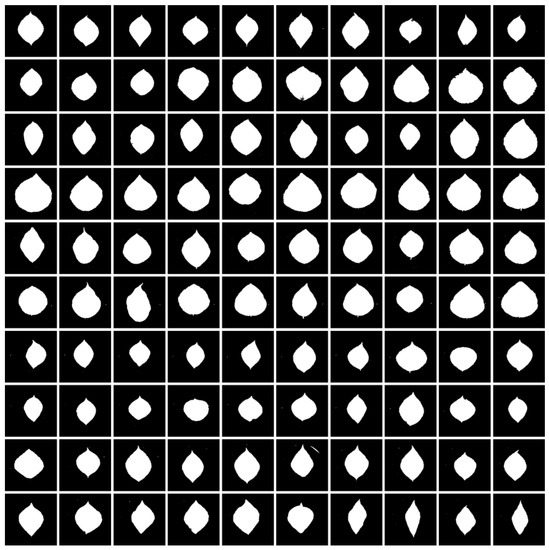The images segmented using OSTU method. This figure was formed by merging a hundred of the P. simonii images segmented with OSTU method. The ten rows of the figure showed the segmented images of ten P. simonii plants, including P00–P09 as in Figure 1, arranged from top to bottom. The ten segmented images located at each row of the figure denoted the ten leaves of a P. simonii plant (from left to right).