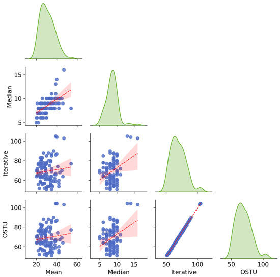 The relationship between four diverse threshold values. These threshold values included Mean, Median, OSTU and Iterative threshold. KDE (Kernel density estimates) plots for the four threshold values were located on the diagonal of this figure and marked in green. The scatter plots were located on the lower triangles of the figure. The data points and best-fit lines in the scatter plots were indicated in blue and red, respectively.
