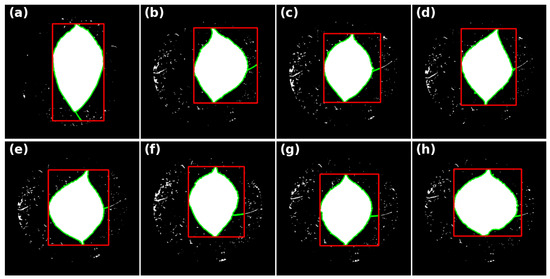 The biased estimates of morphological features in the Mean-segmented images: (a) It indicates the overestimated length of a single leaf in a Mean-segmented images. (b–h) These indicate the overestimated width of a single leaf in seven Mean-segmented images. The bounding boxes around a leaf object in the segmented images are colored red. The contour line of the leaf object is marked in green.