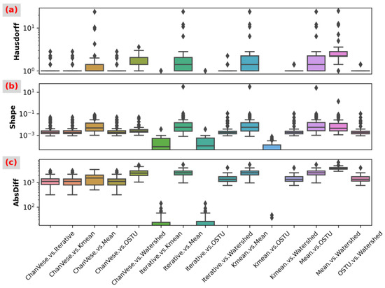 The pairing similarity between the objects isolated from these poplar leaf images using six different methods: (a–c) show the Hausdorff distance, the shape distance and the absolute difference between the leaf objects segmented from an image with the six methods, including Chan-Vese, Iterative threshold, Kmean, Mean, OSTU and Watershed. The X-axis represents the two methods which need to be compared in pairs, such as ChanVese vs. Iterative and ChanVese vs. Kmean. The lower and upper whisker of the boxplot graph are Q1 − 1.5 × IQR (interquartile range) and Q3 + 1.5 × IQR, respectively. The values flanking the lower and upper whisker are plotted as diamond.