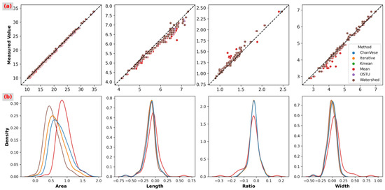 The differences for width (KS test p-value = 0.0149) and length-to-width ratio (KS test p-value = 0.0305) traits using the Mean approach might not fit a normal distribution (p-value < 0.05). It was consistent with the result of noises and contours in the segmented images produced by the six methods. In addition, the distribution of Mean-based values was distinctly different from those of the other five methods (Figure 8b). These findings suggested that the other five methods overperformed the Mean-based method.