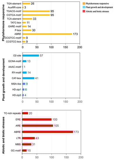 cis-regulatory elements (CREs) were categorized into the following three main groups based on their functions: plant growth and development, phytohormone responsiveness, and responses to abiotic and biotic stresses (