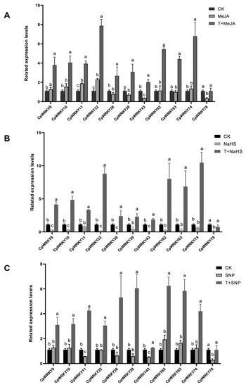 CpWRKY genes were expressed under these treatments, and the combination treatment exhibited a superior capacity to induce the up-regulation of