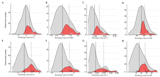 Number distribution of selected parent clones of Chinese fir trees under selection intensities of 1.554 and 2.023 based on breeding value in Longshan (A–D) and Xiaokeng (E–H). H: total tree height, DBH: diameter at breast height, V: stem volume, WBD: wood basic density, G: realized gain. Grey indicates all parents; red represents the selected parents with excellent growth and wood traits; solid line indicates the mean breeding values of all parents; dotted line represents the mean breeding values of the selected parents with excellent growth and wood traits.