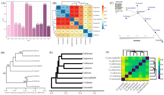 SNP substitution type, genetic distance between samples, and phylogenetic tree. (A) SNP type histogram statistics; (B) SNP genetic distance heatmap between samples; (C) phylogenetic tree construction between samples; (D) network graph showing genetic distance between samples; (E) genetic distance clustering; (F) genetic distance heatmap analysis. Note: G.—Gleditsia; G. chinensis—Gymnocladus chinensis; G. dioicus—Gymnocladus dioicus.