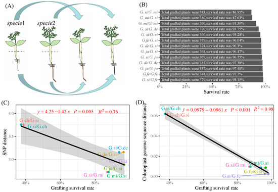 Schematic diagram of grafting and correlation analysis of grafting survival rate. (A) Schematic diagram of grafting; (B) statistics of graft survival rate; (C) correlation analysis between genetic distance between species and graft survival rate based on the Super-GBS; (D) correlation analysis between genetic distance between species and graft survival rate based on chloroplast genomes. Note: In (B), the text in the bar plot represents the number of grafts and the graft survival rate. The homologous grafting sample points were removed in (C,D).