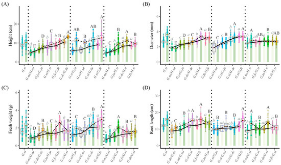Comparison between phenotypes of homologous/heterologous grafted seedlings of Gleditsia. (A) Plant height (Ph); (B) diameter; (C) fresh weight (Fw); (D) root length (Rl). Note: for each species, the left bar filled with #DBE8B4FF indicates 1.5 months after grafting; for each species, the right bar filled with #3C8200FF indicates 3 months after grafting. The dashed lines divide the graph into four parts, seedlings, homologous grafting, heterologous grafting (with G. sinensis as the scion), and heterologous grafting (with G. sinensis as rootstock), respectively. Lowercase letters indicate significant differences at p < 0.05 among the grafted plants after 1.5 months; capital letters indicate significant differences at p < 0.05 among the grafted plants after 3 months. The order of the X-axis factors corresponding to each subregion is arranged in the order of the mean value of the index.