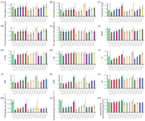 The photosynthetic and physiological characteristics of the Gleditsia seedlings and grafted seedlings. (A) Chlorophyll a (Chla); (B) chlorophyll b (chlb); (C) carotenoids (Car); (D) total chlorophyll content (Chl(a + b)); (E) the ratio of chlorophyll a/b (chla/b); (F) SPAD; (G) maximal PSII photochemical efficiency (Fv/Fm); (H) maximum light quantum efficiency (QY); (I) Ft; (J) steady-state fluorescence decay rate (Rfd); (K) nonphotochemical quenching (NPQ); (L) qN; (M) transpiration rate (Tr); (N) net photosynthetic rate (Pn); (O) intercellular CO2 concentration (Ci). Note: data are shown as means ± SEs (n = 3), and different lowercase letters indicate significant differences (p < 0.05) among groups.