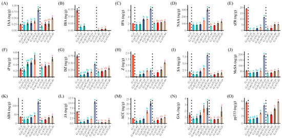 Differences in the hormone contents in grafted plants. (A) Bar plot of indole-3-acetic acid (IAA) content; (B) bar plot of 3-indolebutyric acid (IBA) content; (C) bar plot of 3-indolepropionic acid (IPA) content; (D) bar plot of 1-naphthaleneacetic acid (NAA) content; (E) bar plot of trans-zeatin riboside (tZR) content; (F) bar plot of N6-isopentenyladenine (iP) content; (G) bar plot of dihydrozeatin (DZ) content; (H) bar plot of zeatin (Z) content; (I) bar plot of salicylic acid (SA) content; (J) bar plot of methyl 5-methylsalicylate (MeSA) content; (K) bar plot of abscisic acid (ABA) content; (L) bar plot of jasmonic acid (JA) content; (M) bar plot of 1-aminocyclopropane-1-carboxylic acid (ACC) content; (N) bar plot of gibberellin GA3 content; (O) bar plot of paclobutrazol (PP333) content. Note: data are shown as means ± SEs (n = 3), and different lowercase letters indicate significant differences (p < 0.05) among groups.