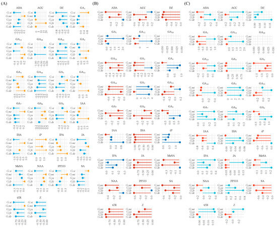 An analysis of the ratios between hormones (Figure S4) showed that G. japonica, G. japonica/G. japonica, and G. fera/G. fera had high ABA/Z values, and G. sinensis had the highest CTK values (tZR+iP+DZ+Z). The GA3/ABA and NAA/ABA values of G. fera, G. fera/G. fera, and G. sinensis/G. fera were relatively higher than those of the other plants. G. microphylla, G. microphylla/G. microphylla, and G. sinensis/G. microphylla had higher Z/IAA and Z/ABA peaks. An analysis of the correlations between the different hormones (Figure S5) revealed significant positive correlations between NAA and MeSA, as well as between the contents of GA1, GA4, GA8, GA24, NAA, and ABA.