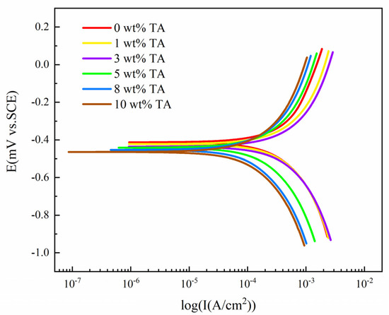 By analyzing Figure 1, it can be observed that as the concentration of tannic acid increased, of W18Cr4V in the solution gradually shifted to the negative side. The anodic slope decreased with the increase in tannic acid concentration. The trend of the cathodic slope was to increase slightly first and then decrease significantly, with significant changes starting at 5 wt% TA. Additionally, the shift in the cathodic part of the polarization curve was more pronounced, while the shift in the anodic part was relatively uniform.
