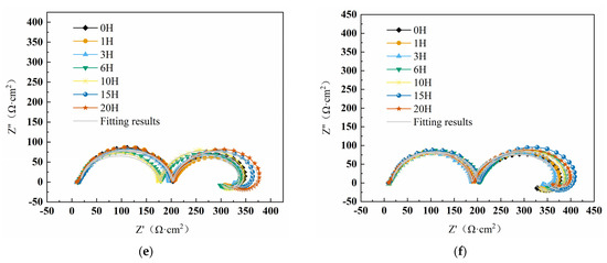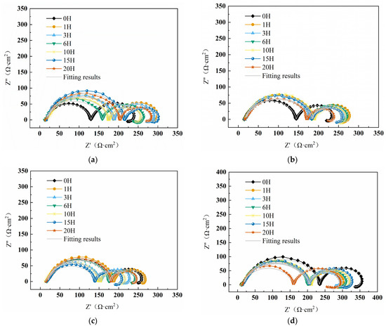 This experiment used CS350H (Wuhan KST Instruments Co., Wuhan, Hubei Province, China) for EIS testing. Before the experiment began, the samples were first soaked in the solution for 0.5 h to stabilize the OCP. For samples continuously immersed for 0 h, 1 h, 3 h, 6 h, 10 h, 15 h, and 20 h, EIS detection was performed separately. In a stable OCP state, the automatic detection frequency range was Hz, and the signal amplitude disturbance was 10 mV. ZView software (3.10, AMETEK SCIENTIFIC INSTRUMENTS Co., Ltd., Poli, PA, USA) was used for fitting and impedance analysis.
