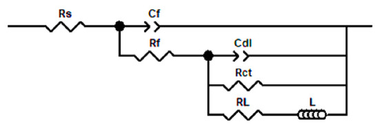 An equivalent circuit model was used to fit the impedance spectrum curve, and the fitting circuit is shown in Figure 3. In the model, represents the resistance of the solution, represents the capacitance between the corrosion product film and the solution, represents the resistance of the corrosion product film, represents the capacitance between the corrosion product film and the substrate, represents the electron transfer resistance, represents the electron migration resistance in the corrosion nucleation area, is the inductance, and and together describe the surface corrosion reaction. The corrosion or inhibition efficiency were calculated using Formula (4), and the fitting data are summarized in Table 4.