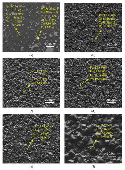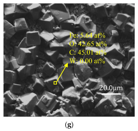 SEM and EDS images of W18Cr4V after treatment under different conditions for 20 h (unprocessed (a), 0 wt% TA (b), 1 wt% TA (c), 3 wt% TA (d), 5 wt% TA (e), 8 wt% TA (f), 10 wt% TA (g)).