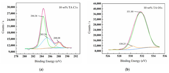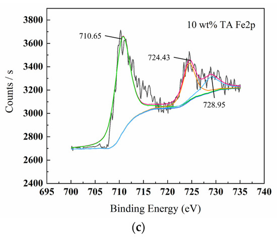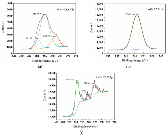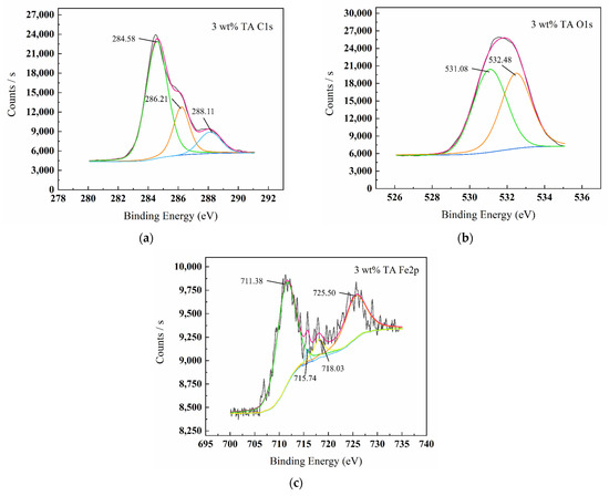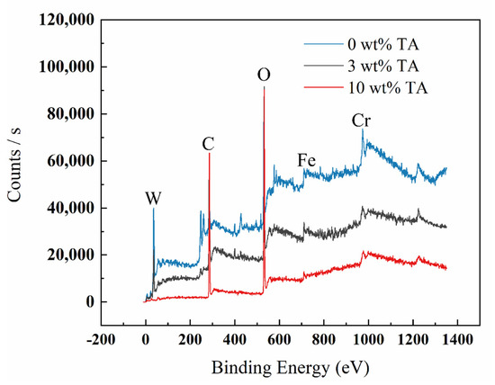 Figure 5, Figure 6, Figure 7 and Figure 8 show the XPS scanning diagrams and detailed spectra of some elements of the surface products of W18Cr4V after soaking for 20 h under different conditions. Observation of the plots reveals that the peaks of C and O were more prominently exhibited under the conditions of 3 wt% TA and 10 wt% TA compared to the conditions of 0 wt% TA. C and O are the basic components of the reaction products, so it can be proved that the iron–tannic acid complexes were adsorbed on the surface of W18Cr4V after the addition of tannic acid. Additionally, the content of iron and its oxides decreased in the conditions of 3 wt% and 10 wt% compared to those in the conditions of 0 wt% TA, which also indicated that the corrosion products were covered on the surface of W18Cr4V. The peaks of W and Cr existed in the environment of 0 wt% TA, but the intensities of these two elements decreased in other conditions, and this phenomenon further confirmed that the corrosion products were covered on the surface of the specimen. The binding energies of the XPS peaks and their possible corresponding compounds are shown in Table 5.