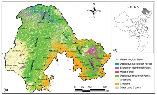 Schematic diagram of the Great Khingan forest area. (a) The location of the Greater Khingan Mountains region in China. (b) Land cover in the Greater Khingan Mountains region.