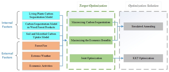 This paper proposes a new model for carbon sequestration that takes into account living plants, wood products, and soil components, as well as external factors such as forest fires, extreme weather conditions, and human activities, in order to address the gaps identified above. Furthermore, we introduce forest-management plans with different objectives, including carbon sequestration maximization, economic benefits’ maximization, and joint optimization, using the harvesting ratio in each forest area as the decision variable. We employed single-objective and multi-objective optimization methods based on the simulated annealing and Karush–Kuhn–Tucker (KKT) algorithms to obtain optimized forest-management plans. The main contributions of this paper can be summarized as follows: