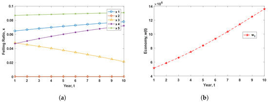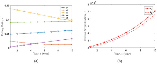 The trend of (a) the logging proportion for five forest areas (x1 to x5) and (b) the optimal carbon-sequestration value (z1) over a 10-year period without external influences.
