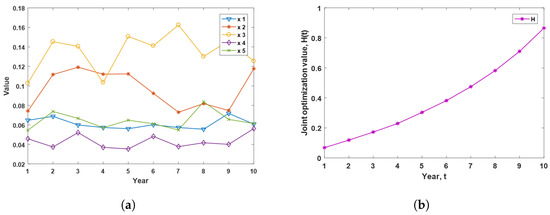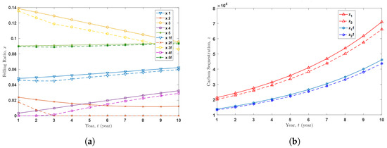 Firstly, the simulated annealing algorithm obtains the maximum carbon sequestration and corresponding logging proportion distribution over ten years without considering external factors. Figure 4 presents the trend of the logging proportion and the optimal carbon-sequestration value. Figure 4a shows the annual logging plan for the five forest areas as shown in Table 1. It is observed from Figure 4a that the five curves are relatively smooth and barely intersect. Combining the forest area parameters and model principles, it is noted that the initial logging proportion values are related to the total stock volume of each forest area rather than the unit stock volume. Furthermore, forest areas with high carbon-sequestration capacity often do not have an advantage in the logging ratio, owing to their significant contribution to carbon storage. Each curve’s trend is related to each forest area’s growth rate. The forest area corresponding to x3 has the highest growth rate, resulting in the curve with the most decline, while the forest area corresponding to x4 has the smallest growth rate of 0.071, resulting in the steepest, positive slope.
