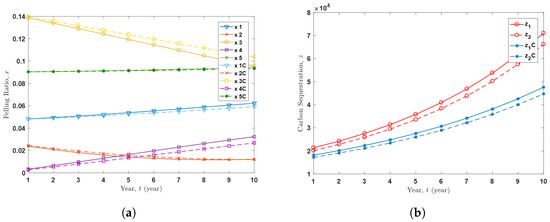 In Figure 7a, the optimal harvesting schedule for five forest areas (x1 to x5) is presented, focusing on maximizing economic benefits over ten years. The dashed line represents the logging plan based on a uniform harvesting strategy, while the solid line represents the optimized plan for maximizing economic benefits. It can be seen that, when optimizing for economic benefits, the influence of the tree growth rate on the changing trend of logging ratios is nearly identical to the optimization results aimed at maximizing carbon sequestration. The difference between the two optimization results lies primarily in the initial values of the logging ratios, which are affected by the variations in unit stock volume. Forest areas with higher unit stock volumes may occupy higher initial positions regarding logging ratios. In Figure 7b, the economic benefits for normal conditions (solid line) and under uniform harvesting (dashed line) are compared over ten years. The simulation results showed that the optimized economic benefits significantly outperformed the uniform harvesting strategy, indicating the effectiveness of the proposed economic benefits’ maximization model.