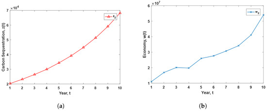 The main reason for this is that the growth rate affects the change in the total stock volume. It is clarified that the total stock volume of Polar forest increases gradually to the maximum point with time, where x3 intersects with x1. Figure 4b compares carbon-sequestration values in an optimized and proportionally averaged logging plan. We can find that the increasing slope of the optimal carbon-sequestration value becomes larger over time. The carbon-sequestration predictions presented in z2 demonstrate the amount of carbon storage expected without optimized logging plans. It is evident from the data that the optimized logging strategy significantly enhances carbon sequestration, with the degree of improvement increasing over time.